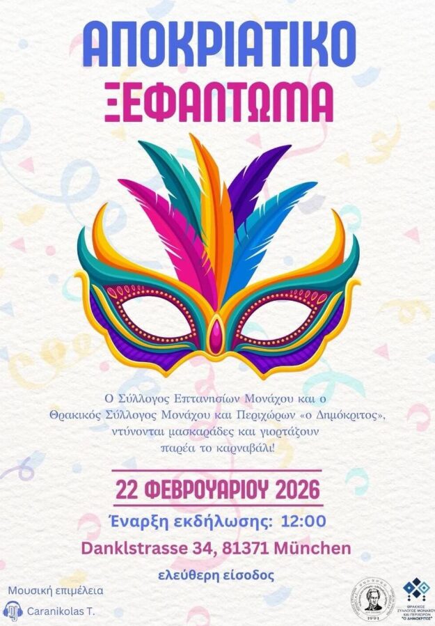 Ο Σύλλογος Επτανησίων Μονάχου και ο Θρακικός Σύλογος σάς προσκαλουν με μεγάλη χαρά σε μια βραδιά γεμάτη κέφι, χορό και παράδοση! Αποχαιρετάμε τις Απόκριες με τον πιο εορταστικό τρόπο και σας περιμένουμε όλους να διασκεδάσουμε μαζί.