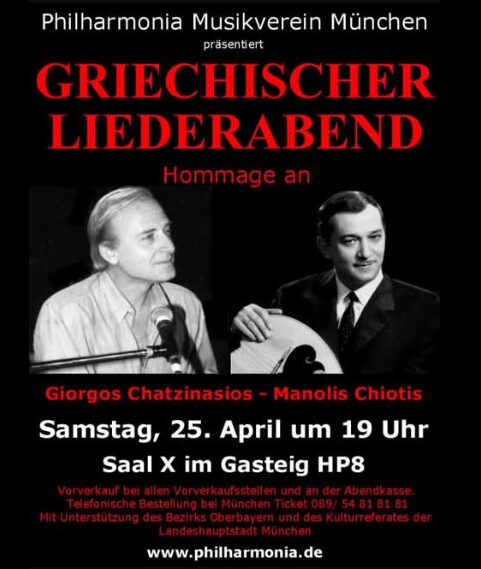 Ο Philharmonia Musikverein München παρουσιάζει μια μοναδική μουσική βραδιά, έναν «Ελληνικό Λογοτεχνικό/Μουσικό Εσπερινό» (Griechischer Liederabend), αφιερωμένο σε δύο κορυφαίες μορφές της ελληνικής μουσικής: τον Γιώργο Χατζηνάσιο και τον Μανώλη Χιώτη.