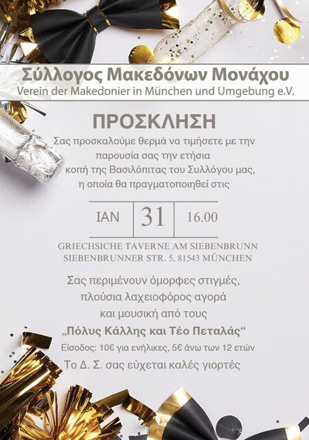 Ο Σύλλογος Μακεδόνων Μονάχου τηρεί την παράδοση και μας προσκαλεί με χαρά στην ετήσια εκδήλωση για την κοπή της Βασιλόπιτας. Μια ευκαιρία να βρεθούμε όλοι μαζί, […]